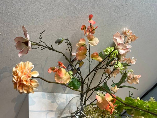 Een prachtig zacht ingetogen boeket bestaande uit perzikachtige kleuren. Uitgewerkt in een hoogwaardige zijden kwaliteit die zonder onderhoud in bloei zal blijven. Laat dit boeket een vleugje elegantie in uw interieur brengen. Duurzaam groen!